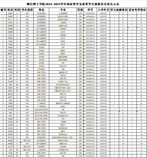 根据上级有关部门的通知要求,结合我校《关于做好2024-2025学年各类奖学金评审工作的通知》,经各学院评审,学校评审委员会审核,烟台理工学院2024-2025学年国家奖学金拟推荐公示名单已初步确定。为进一步增加工作透明度,保证评选结果客观、公正、合理、准确,现将拟推荐名单予以公示。